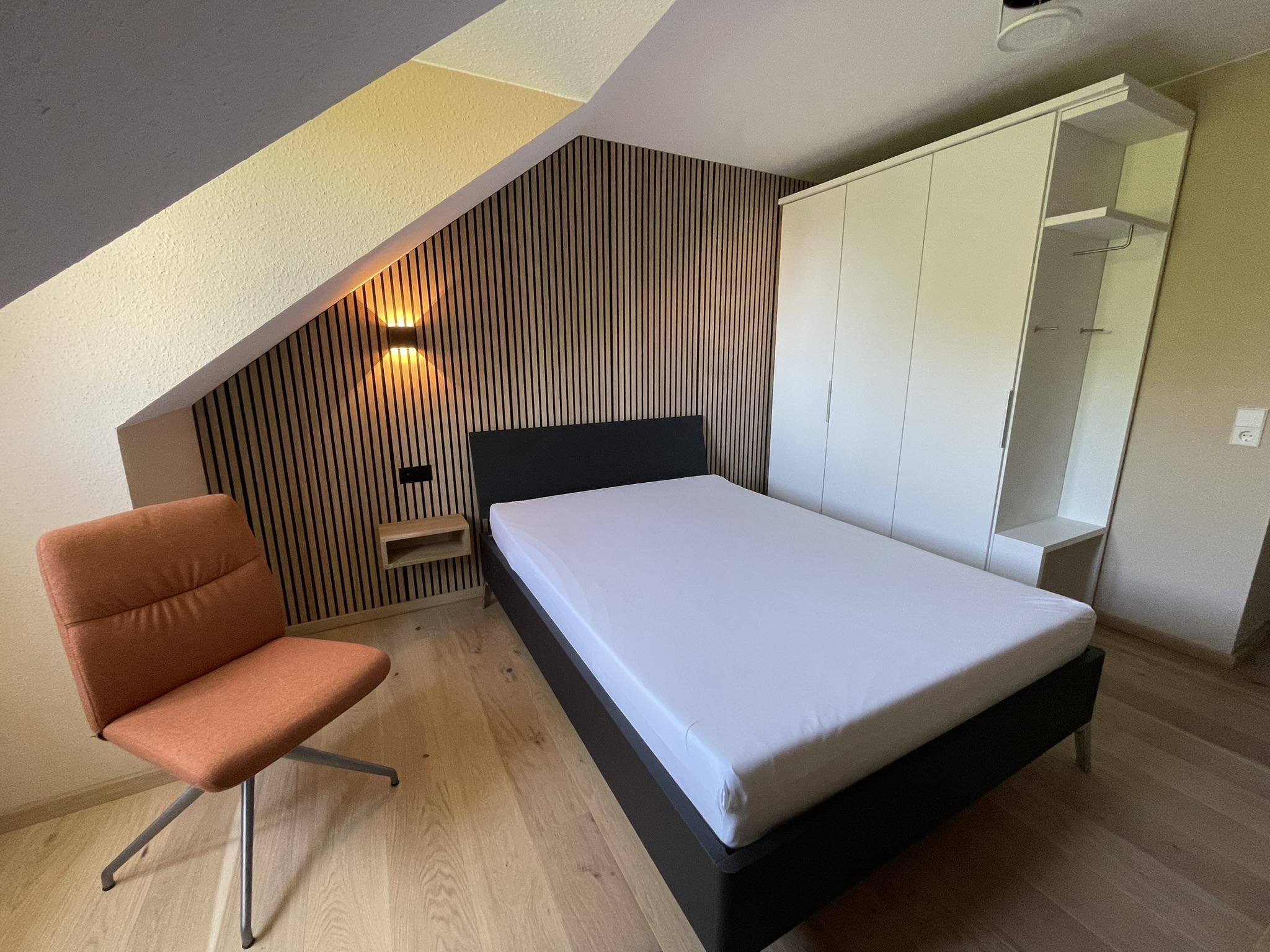 Wir tauschten die kalten Farben und Materialien (blaues Linoleum u. Vorhänge / weisse Rauhfaserwände) – gegen warme (Böden u. Möbel in Eiche natur und beige Wände, Leinenvorhänge u. Bettwäsche, Betten, Leuchten, Lichtschalter/Steckdosen, tiefwarmes antrazit passend zur Eichenlamellenwand, sowie Leuchten) und planten als ruhigen Akzent noch bequeme rostorangene Sesselstühle (stressless) ein.